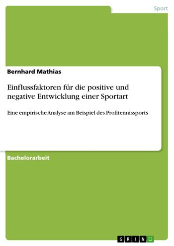 Bachelorarbeit aus dem Jahr 2011 im Fachbereich Sport - Sportökonomie, Sportmanagement, Note: 1,3, Hochschule für angewandtes Management GmbH, Sprache: Deutsch, Abstract: Einleitung „Tennis ist tot!“ „Tennis ist nicht mehr interessant.“ „Der Tennisboom ist vorbei!“ oder „Erfolg in der Doppelrolle – Wimbledon-Sieger Petzschner“ (Spiegel-Online) „Ein Sternchen greift nach den Sternen“ (Julia Görges in der Bild) „Tennis-Stern Petkovic“ (Andrea Petkovic in der Bild) An den obigen Schlagzeilen, welche man in diesem oder in leicht verändertem Wortlaut in der Vergangenheit gehört hat, lässt sich erkennen, wie unterschiedlich die öffentliche Wahrnehmung sein kann. Bis vor kurzem waren vor allem die ersten drei Schlagzeilen meinungsbildend, wenn es darum ging, den aktuellen Stand im Tennissport zu beschreiben. Seit einigen Monaten gibt es aber auch bereits wieder andere Schlagzeilen und Stimmen, die die Runde machen. Grund dafür sind z.B. der Wimbledonsieg 2010 von Philipp Petzschner zusammen mit Jürgen Melzer im Doppel , aber vor allem auch die Erfolge unserer jungen Damen in den letzten Wochen. Andrea Petkovic, aktuell die deutsche Nummer 1 im Damentennis und vor den French Open 2011 die Nummer 12 der Weltrangliste. Julia Görges die Siegerin des Porsche Tennis Grand Prix 2011 steht ebenfalls unter den zwanzig besten Spielerinnen der Welt. Ob die letzten drei Schlagzeilen die ersten drei Schlagzeilen über kurz oder lang ersetzen werden, wird in dieser Arbeit nicht die Frage sein, sondern es wird vor allem auch die Zeit zeigen. Entscheidend ist aber, dass über die Jahre ein Meinungsbild geschaffen wurde, welches mit Sicherheit nicht nur ein solches darstellt, sondern auch durch Zahlen und Fakten belegbar ist. Beispielsweise hat Tennis als Sportart an Wert verloren, als die großen Erfolge, der Becker, Graf und Stich’s nicht mehr das Geschehen prägten. Im Rahmen dieser Arbeit soll es primär darum gehen, dass positive oder negative Faktoren aufgezeigt werden, die Einfluss auf die Entwicklung einer Sportart haben können. Um dies beantworten zu können, muss man sich natürlich mit der Entwicklung der Sportart „Tennis“ auseinandersetzen. Dabei ist eine Trennung zwischen nationaler und internationaler Entwicklung und Wahrnehmung vorzunehmen. Gerade im Tennissport lässt sich hier ein klarer Unterschied in den verschiedenen Entwicklungen erkennen. Lange Jahre sprach man von einem Tennisboom und dann sprach man aber schnell auch von genau dem Gegenteil. Wie kommt es zu eben diesem genannten „Boom“ und wie kommt es dann zu der konträren Negativentwicklung? Das ist nur eine von vielen Fragen, da man sich stellen muss. ...