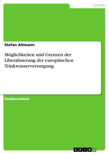 Studienarbeit aus dem Jahr 2011 im Fachbereich Ingenieurwissenschaften - Bauingenieurwesen, Note: 1,3, Frankfurt University of Applied Sciences, ehem. Fachhochschule Frankfurt am Main (Bau), Sprache: Deutsch, Abstract: Die europäische Trinkwasserversorgung wird durch Liberalisierungsvorhaben verändert. Während in einigen Länder bereits viele private Versorger aktiv sind, dominieren in anderen noch Staatsunternehmen. Ziel der Arbeit ist, einen Überblick über die derzeitige Situation zu geben und dabei Möglichkeiten und Grenzen einer Liberalisierung des Sektors zu zeigen.