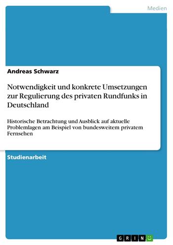 Studienarbeit aus dem Jahr 2011 im Fachbereich Medien / Kommunikation - Mediengeschichte, Note: 1,7, Freie Universität Berlin, Sprache: Deutsch, Abstract: Während der Etablierung von Rundfunk in Nachkriegsdeutschland setzte sich zunächst ein „Public Service-Modell“1 nach Vorbild der BBC durch. Sowohl die herrschende Frequenzknappheit als auch die verbreitete Annahme der suggestiven Breitenwirkung des Mediums verhinderten noch lange darauf das Aufkommen von privat-rechtlich betriebenen Rundfunkstationen und –sendungen. Der technische Fortschritt und die Kräfte des Marktes erodierten dieses gesellschaftliche Paradigma jedoch in den nachfolgenden Jahrzehnten, wobei der Rundfunk laut Bundesverfassungsgericht doch eine besondere Bedeutung für die demokratische Willensbildung hat, sozusagen im Herzen der Gesellschaft schlägt als „Medium und Faktor der Meinungsbildung“. Die Angst um den Mißbrauch publizistischer Macht liegt ergo im Blickfeld aller juristischen und legislativen Bemühungen zur (De-)Regulierung des Rundfunks. Die Liberalisierung des Rundfunkmarktes in den 1980er Jahren brachte in der Folge eine Vielzahl von neuen Problematiken auf den Plan. Für etliche vorher nicht existente Fragestellungen mussten Regulative und Instrumente entwickelt, Instanzen geschaffen werden. Um die weitschweifende Thematik der Strukturierung und Umsetzung von Rundfunkregulierung als kommunikationspolitischem Prozess etwas einzugrenzen, beschränkt sich diese Arbeit neben den grundständigen legalen und funktionalen Aspekten auf die Erörterung der Regulierung von bundesweit ausgestrahltem Fernsehen als (noch) aktuellem Leitmedium. Desweiteren kann hier aus Platzgründen nur ein skizzierender Überblick über die komplexen Vorgänge innerhalb mittlerweile hochentwickelter Institutionen gegeben werden.