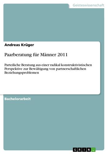Bachelorarbeit aus dem Jahr 2011 im Fachbereich Soziale Arbeit / Sozialarbeit, Note: 1,7, Ostfalia Hochschule für angewandte Wissenschaften Fachhochschule Braunschweig/Wolfenbüttel , Sprache: Deutsch, Abstract: Mein Vorhaben ist es, im Rahmen dieser Arbeit zu prüfen, ob unter Sichtweise des Radikalen Konstruktivismus, ausschließlich eine Beratung für Männer denkbar ist. Ist es möglich ausschließlich den Mann, welcher sich in einer Partnerschaft mit Beziehungsproblemen befindet, zu beraten? Diese Fragestellung möchte ich bearbeiten aufgrund vom Bestehen von Beziehungsproblemen bei Paaren, einer hohen Scheidungsrate (Grafik 1) in Deutschland und meiner Vermutung, dass Probleme mit einer Frau in Beziehungen höchstens die Endsequenz einer Problemabfolge sind, aber in Ihrem Ursprung nichts mit der Bindung zu dieser Frau zu tun haben und somit auch nicht die Begegnung mit einer Frau zur Lösung führt. Die emotionale Begegnung mit einer Frau könnte allerdings zur Prüfung der eigenen charakterlichen Stabilität dienlich sein.