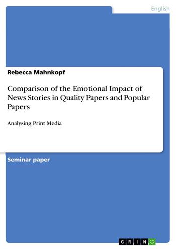 Seminar paper from the year 2005 in the subject English Language and Literature Studies - Linguistics, grade: 2,0, University of Rostock, language: English, abstract: Many articles one reads in a newspaper have an emotional impact on the addressee. This impact can involve the public in general or only a limited part of the readership. For instance a headline like One of these players will be axed (from News of the World, September 4, 2005) will probably not effect the whole British readership but only a part of it, namely those who are interested in soccer. They might be sad that players of their favourite team will be dismissed. (Ungerer in Niemeyer/Dirven 1995: 307) But how is it possible for a news story to cause emotions in the reader? In my term paper I am going to describe the system which is responsible for the emotional impact of news stories. Afterwards I will go on to give a short overview of the different kinds of emotions which can be evoked. My next section will take us to the main concern of this paper: the comparison of quality and popular papers regarding their emotional impact. I will analyse a news story from The Guardian which is one of the British quality papers. Then I will have a detailed look at a news story from the British popular paper News of the World which deals with the same issue. I will try to find out which of both the papers arouses more or greater emotions in the reader and what means they use to achieve that. What are the different ways in which emotions are approached in the two kinds of newspapers? In my conclusion I will evaluate the comparison and make an effort to answer the question asked before.