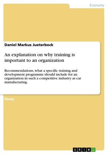 Essay from the year 2009 in the subject Leadership and Human Resources - Miscellaneous, grade: 72, Curtin University of Technology (Curtin Business School), course: Human Resource Management 200, language: English, abstract: To achieve its objectives a company needs a business strategy. It can choose between innovative prospector, quality enhancer or cost-defender strategy. According to that the firm has to apply an appropriate employment strategy. This can be the economic or the relational approach. The economic approach relies on hard skills whereas the relational approach focuses on behavioural skills. Depending on the employment strategy different ways of training and development come to mind for workers and managers. This report will explain the mentioned business strategies as well as the resulting employment strategies. Furthermore, means for training and development for non-managerial employees and for managers are explained. This report aims at giving recommendations for the automobile industry. Therefore, the successful automotive companies BMW, Daimler, Volkswagen, Chrysler and Toyota are examined according to their training and development opportunities. Further, it will be proven that the automobile industry applies the innovative prospector strategy and has the possibilities to invest heavily in human resources. This report shows that beside traditional training and development measures, corporate universities and e-learning support the innovative prospector strategy. The size of automobile companies enables them to invest in these costly measures. In the end, they will be critically evaluated and finally recommended.