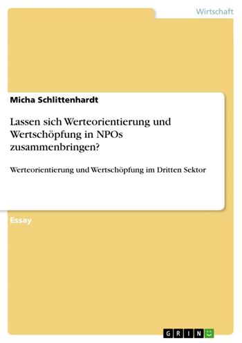 Essay aus dem Jahr 2011 im Fachbereich BWL - Unternehmensethik, Wirtschaftsethik, Note: 1,5, Karlshochschule International University, Sprache: Deutsch, Abstract: Was bedeutet eigentlich Werteorientierung, und wie lässt sich dieser Begriff interkulturell ausleben? Braucht es hier sogar eine genauere Definition? Und wie kann diese Werteorientierung der NPO helfen sich zu entwickeln und zu wachsen? Bedarf es nicht doch einer Wertschöpfung über die eigene Bedarfsdeckung hinaus?