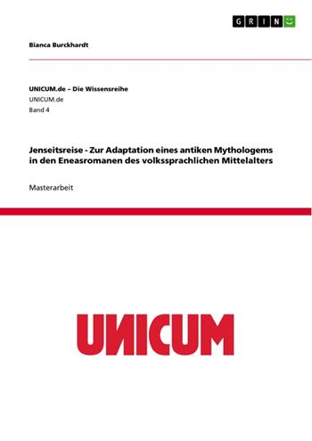 Masterarbeit aus dem Jahr 2012 im Fachbereich Literaturwissenschaft - Vergleichende Literaturwissenschaft, Note: 1,1, Universität Siegen (Philosophische Fakultät), Sprache: Deutsch, Abstract: INHALTSVERZEICHNIS 1. Einführung: Tod und Jenseits in den Kulturen 1 1.1 Jenseitsvorstellungen in der römischen Antike 4 1.2 Jenseitsvorstellungen im christlichen Mittelalter 8 1.2.1 Biblische und frühchristliche Texte 8 1.2.2 Visionsliteratur des Mittelalters 12 2. Vergil: Aeneis (um 29-19 v. Chr.) 15 2.1 Die Unterweltsfahrt 16 2.2 Bedeutung Vergils für das Mittelalter 20 3. Der Roman d’Eneas und Veldekes Eneit 21 3.1 Vorbemerkung: Der Antikenroman 23 3.2 Veränderungen der Unterweltsfahrt 24 3.2.1 Die Götter 25 3.2.1.1 Einfluss der olympischen Götter und des christlichen Gottes 26 3.2.1.2 Hades, Persephone und der Teufel 30 3.2.2 Sibylle, die Grenzgängerin 33 3.2.3 Kreaturen der Unterwelt 38 3.2.3.1 Personifikationen, Monster und andere Tiere 39 3.2.3.2 Charon, der Fährmann 44 3.2.3.3 Cerberus, der Höllenhund 46 3.2.3.4 Minos und Rhadamantus, Richter und Herrscher 49 3.2.4 Topographie der Unterwelt 51 3.2.4.1 Der Eingang zur Unterwelt 52 3.2.4.2 Am Ufer des Styx bzw. Phlegeton 54 3.2.4.3 Die Asphodelischen Felder und das Purgatorium 57 3.2.4.4 Tartarus und die eigentliche Hölle 61 3.2.4.5 Elysium und Paradies 65 3.2.5 Seele und Seelenwanderung 69 4. Fazit 75 5. Literaturverzeichnis 80 6. Abbildungsverzeichnis 85 7. Anhang 86 7.1 Bilder der Handschrift h (Heidelberger Papierhandschrift) – Cod.pal.germ. 403 86 7.2 Bilder der Handschrift B (Berliner Miniaturhandschrift) – Cod.germ.Fol. 282 88