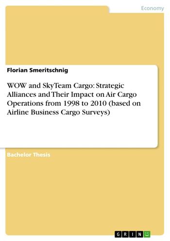 Bachelor Thesis from the year 2012 in the subject Business economics - Supply, Production, Logistics, grade: 1,0, Vienna University of Economics and Business , course: Transportwirtschaft und Logistik, language: English, abstract: The formation of highly integrated strategic alliances in the airline industry started during the1990’s with Star Alliance as the first global player, as passenger airlines faced deregulation and wanted to support their growth and expansion in international markets. For cargo companies, this type of integration came around later at the beginning of 2000. As a result of this increased co-operation, major alliances were formed with the launch of SkyTeam Cargo and WOW. Beginning at the dawn of the new century, these alliances should mark a cornerstone that enables long term success and survival through synergy effects and higher competitiveness individually and as a group. Now, a decade later, WOW and SkyTeam Cargo have evolved, but in different directions and not all members or ex-members are content with the results. Strategic alliances in air transport have been studied widely in recent publications, most of which just cover the passenger side of the business. There is a lot of information, statements and common knowledge about what benefits alliances can bring to its members, but a literature review leads to the fact that research is very sparse when it comes down to evaluating the actual impact of alliance integration on air cargo carriers’ standing. Strategic Alliances (WOW, SkyTeam Cargo) in Air Cargo Operations: It is the purpose of this bachelor thesis to analyze and interpret the impact of a strategic alliance on cargo airlines‘ Revenue-Ton-Kilometers key figures (provided by Airline Business 1998-2010) and market share developments. The goal is to provide answers to the questions if air cargo operators did profit from alliance integration and why that was the case or not? Can alliances create value for their respective members by increasing their market share in terms of RTK? Additional questions that will be addressed in the process of answering these core questions: •What are the main benefits and disadvantages for alliance members •What major challenges do (prospective) members face in an alliance •Are there common success and stability factors and why do alliances fail •What alternatives are there to alliance formation