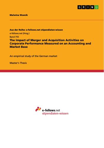 Master's Thesis from the year 2013 in the subject Business economics - Controlling, grade: 1,3, University of Cologne (Seminar für allgemeine BWL und Controlling), language: English, abstract: “Warren Buffett swallows Heinz: Sauce for the sage” – a typical takeover announcement was published lately on 14th February 2013. Warren Buffett, a well known inves tor, acquired along with the financial investor 3G Capital the H. J. Heinz Company for $ 28 billion. This is likely to become the largest transaction in the food industry. The company's stock price rose more than 20.0 percent after the publication which is a very characteristic reaction to deal announcements. Hence, the important question is, if transactions, such as the takeover of the H. J. Heinz Company, affect the corporate performance consistently. In general, the core idea about mergers and acquisitions (M&A) is to generate additional future growth if for example organic growth is limited. If two companies merge or a target is bought by another company (the acquirer), shareholders believe in synergy effects. These are revenue enhancements, cost reductions, tax gains and reduced capital requirements leading to business growth and thus to a higher value of the new company. However, it is questionable if this theory can also be experienced in the real world. Ever since the effects of M&A have been analysed, the market of the United States (US) was used as data source. This is plausible due to the fact that the very first information was well recorded for US companies. It is remarkable that literature contributes very little research on Europe, although the number of announced European transactions is comparable to those of the US. For example, in 2007 the European deals volume overtook the one from the United States of America (USA) for the first time. Moreover, research on single European countries almost never exists or only rarely. One exception is the United Kingdom (UK) with an early takeover history beginning in the 1960s. However, European countries should be analysed separately because of its high diversity regarding the accounting framework, the corporate governance or the legal and regulation structure. For instance, Germany is characterised by conservative accounting principles and a high regulation by the banking sector. These issues may also influence the M&A decision making process.