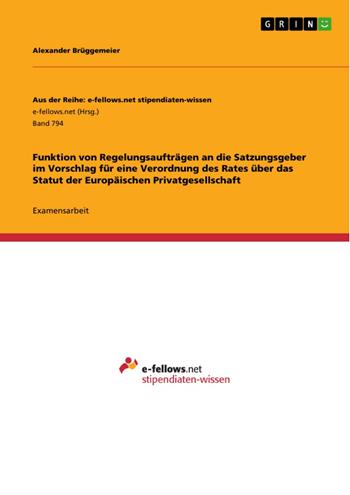 Examensarbeit aus dem Jahr 2010 im Fachbereich Jura - Zivilrecht / Handelsrecht, Gesellschaftsrecht, Kartellrecht, Wirtschaftsrecht, Note: 15, Bucerius Law School - Hochschule für Rechtswissenschaften in Hamburg (Institut für Unternehmens- und Kapitalmarktrecht), Sprache: Deutsch, Abstract: „Small is beautiful“ hieß der Bestseller mit dem der britische Nationalökonom Ernst Friedrich Schumacher 1973 Furore machte. Diesem Titel versucht auch der europäische Gesetzgeber im Kompromissvorschlag des schwedischen Ratsvorsitzes für eine Verordnung des Rates über das Statut der Europäischen Privatgesellschaft zu folgen, indem darin in nur 49 Artikeln die wesentlichen Merkmale der SPE geregelt werden. Ein Schwerpunkt in der bisherigen wissenschaftlichen Auseinandersetzung mit den verschiedenen Verordnungsentwürfen lag auf den wesentlichen Strukturmerkmalen der SPE, der konkreten Ausgestaltung ihrer Organisationsverfassung, ihrer Gründung und Finanzordnung. Daneben stellt die vom europäischen Gesetzgeber angewendete Regelungstechnik mit ihren verschiedenen Regelungsschichten und Strukturen ein interessantes Konzept gesellschaftsrechtlicher Regelsetzung dar. Es wird auf das bislang nur spärlich verwendete und von der Wissenschaft eher stiefmütterlich behandelte Gesetzgebungsinstrument des Regelungsauftrages zurückgegriffen. Den Rege-lungsaufträgen im SPE-VO (ES) wurde bisher fast ausschließlich die Funktion der Vermeidung von Lücken in der Satzung einer SPE zugeschrieben. Diese Ausar-beitung nimmt sich daher der Frage an, ob die Regelungsaufträge daneben noch weitere Funktionen erfüllen und welche Relevanz diese für die Europäische Pri-vatgesellschaft und ihre Funktion im europäischen Binnenmarkt haben. Nach einer allgemeinen Begriffs- und Funktionsbestimmung sollen die Rege-lungsaufträge in das Konzept des SPE-VO (ES) eingeordnet und ihre Funktion im Speziellen herausgearbeitet werden. Im Anschluss soll erörtert werden, inwieweit diese Funktionen einer Flankierung durch weitere Maßnahmen wie Mustersatzungen oder ein Mustergesetz bedürfen, um eine effektive Erfüllung dieser Funktionen zu gewährleisten.