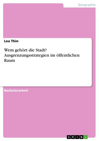 Bachelorarbeit aus dem Jahr 2013 im Fachbereich Geowissenschaften / Geographie - Bevölkerungsgeographie, Stadt- u. Raumplanung, Note: 1,8, Humboldt-Universität zu Berlin (Geographisches Institut), Sprache: Deutsch, Abstract: Sucht man bei Google nach „Wem gehört die Stadt“ stößt man auf über drei Millionen Suchergebnisse. So unterschiedlich all diese Aktionen, Bewegungen und Initiativen auch sind, sie haben eines gemein: sie fordern ein Mitspracherecht an der Gestaltung der Stadt. Der Ursprung der Teilhabe an Stadt ist im öffentlichen Raum zu suchen. Die Ideologie öffentlicher Räume impliziert, dass diese allen zugänglich sind. Inwiefern ist das jedoch Realität? Wer wird von welchen Plätzen ausgeschlossen und welche Mechanismen und Strukturen stehen dahinter? Das Übersichtswerk stellt verschiedene soziologische, stadtgeographische und kulturwissenschaftliche Ansätze zu Dominanzverhältnissen und Ausgrenzungsstrategien im öffentlichen Raum vor. Ausgehend von den vielfältigen Definitionen öffentlicher Räume, widmet sich die Arbeit den Mechanismen und Instrumenten, die zur Ausgrenzung von Individuen und Gruppen im öffentlichen Raum führen. Ein besonderer Fokus liegt dabei auf der Frage, wer über Ausschluss entscheiden darf und wer im Gegenzug ausgeschlossen wird. Dabei wird insbesondere auf die Rolle von Staat (institutionell), Wirtschaft (ökonomisch) sowie der Gesellschaft (sozial) eingegangen. Diese interdisziplinäre Herangehensweise soll einen Überblick über die zahlreichen Forschungsergebnisse der letzten Jahrzehnte geben und zusammenfassende Ergebnisse zu Ausgrenzungsstrategien im öffentlichen Raum liefern.