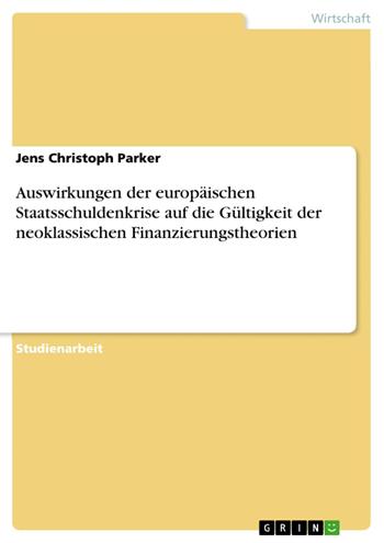 Studienarbeit aus dem Jahr 2012 im Fachbereich BWL - Bank, Börse, Versicherung, Note: 1,4, Universität Potsdam (Lehrstuhl für Betriebswirtschaftslehre mit dem Schwerpunkt Finanzierung und Banken), Veranstaltung: Emerging Capital Markets, Sprache: Deutsch, Abstract: Finanzierungstheorien bieten theoretische Erklärungen für finanzwirtschaftliche Fragestellungen und bilden die Grundlage für Finanzierungsmodelle. Es gibt eine Vielzahl an Ansätzen und aufgrund neuer Erkenntnisse entwickeln sich bestehende Theorien weiter oder neue Ideen entstehen. Ein derartiges Ereignis kann die aktuelle europäische Staatsschuldenkrise sein. Denn besonders Krisen sind häufig Auslöser neuer Entwicklungen. Diese Arbeit stellt deshalb die Frage, welche Auswirkung die europäische Staatsschuldenkrise auf die neoklassischen Finanzierungstheorien hat. Dabei begrenzt sich die Arbeit auf das auf dem einwertigen Ansatz basierende Dean-Modell und die Kapitalmarktheorien Portfolio Theorie, Capital Asset Pricing Modell (CAPM) und Abitrage Pricing Modell (APM). Diese Abgrenzung erfolgt aufgrund der theoretischen und praktischen Relevanz. Darüber hinaus repräsentieren die Modelle die unterschiedlichen Ansätze neoklassischer Finanzierungstheorien.