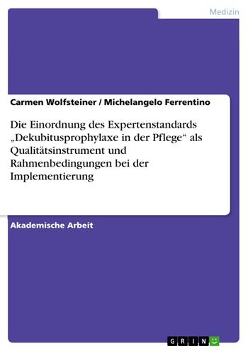 Akademische Arbeit aus dem Jahr 2006 im Fachbereich Pflegewissenschaft - Pflegemanagement, Note: 1,3, , Sprache: Deutsch, Abstract: In dieser Arbeit wird eine Einordnung des Expertenstandards als Qualitätsinstrument vorgenommen und Rahmenbedingungen bei der Implementierung dargelegt. Dabei wird im Detail auf den Bedarf der externen Qualitätsentwicklung in der Pflege sowie dem Deutschen Netzwerk für Qualitätsentwicklung in der Pflege eingegangen. In diesem Kontext wird dessen Rolle im Zusammenhang mit Expertenstandards eingegangen. Nach Darlegung der Entwicklung von nationalen Expertenstandards folgt zur trennscharfen Darstellung der in der pflegerischen Praxis vorfindbaren Instrumente eine definitorische Abgrenzung von Standards, Leitlinien und Richtlinien. Zur Erläuterung der Monodisziplinarität als einem wichtigen Merkmal von Expertenstandards wurde unsererseits der Fokus auf die Professionalisierungsdebatte der Pflege gelegt. Dem folgt eine Diskussion über evidenzbasierte Pflege als Ausgangspunkt für ein professionelles und abgesichertes pflegerisches Handeln. Es folgt die Darlegung von vorliegenden wirtschaftlichen und gesetzlichen Rahmenbedingungen bei der Implementierung, welche zur Erlangung einer systemischeren Sichtweise beitragen sollen. Die von uns identifizierten Grenzen in der Entwicklung von Expertenstandards runden diesen Teil kritisch ab. Aus dem Inhalt: - Externe Qualitätsentwicklung, - Abgrenzung von Standards, Leit- und Richtlinien, - Monodisziplinarität, - Evidence-based Nursing, - Rahmenbedingungen, - Grenzen
