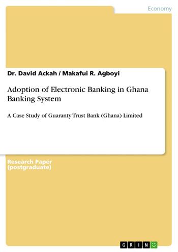Research Paper (postgraduate) from the year 2014 in the subject Business economics - Banking, Stock Exchanges, Insurance, Accounting, grade: A, ( Atlantic International University ) (School of Business and Economics), course: Ph.D. Economics, language: English, abstract: Electronic banking (e-banking) has brought about a revolution in the functioning of banks as it offers major opportunities to banks and their customers. This has made the transition to electronic banking a necessity for banks in order to be viable. Despite its benefits, developing countries still lag behind in the adoption of electronic banking. This study therefore seeks to examine the adoption of e-banking in the Ghanaian banking industry with Guaranty Trust Bank Ghana Limited (GTBank) as the case study to identify the benefits, challenges and critical success factors for the adoption of e-banking in the Ghanaian banking industry. The research made use of questionnaires and interviews to collect data from staff and customers of GTBank. The results of the study indicated that e-banking adoption was a business strategy taken by the bank in response to customer needs and the changing marketing trends in the banking industry. The benefits, challenges and critical success factors of e-banking are also identified and discussed. From the study it is obvious that tremendous benefitssuch as revenue generation, improvement in productivity and efficiency in service delivery and cost savings were derived from e-banking. The lack of a solid technology infrastructure was identified as a major challenge of e-banking adoption in the country. The study however revealed that there is a promising future for e-banking in Ghana.Some recommendations to enhance the adoption of e banking in country are made based on this study.