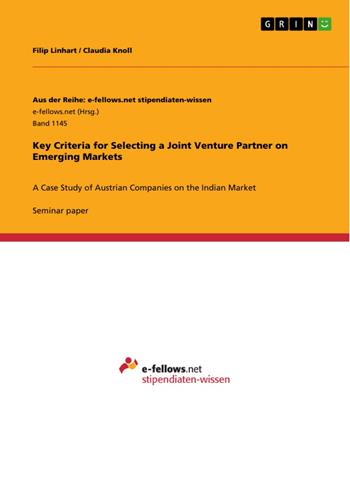 Seminar paper from the year 2014 in the subject Business economics - Business Management, Corporate Governance, University of Applied Sciences Villach, language: English, abstract: This case study paper focuses on defining the key criteria for selecting a joint venture partner on emerging markets to minimize the risks of the partnership failure. The literature dealing with general partner selection criteria is rich. Only a little research was, however, conducted in terms of emerging economies. Therefore, the study combines a theoretical model with an empirical evidence to extend knowledge in this particular area. The literature review results in four main partner selection criteria, such as human resources (tangible resources), local market knowledge (intangible resources) as well as business and governmental networks. An empirical research was conducted through qualitative interviews to challenge the theoretical findings. The sample consisted of two leading Austrian manufacturing companies operating a joint venture in India. Although those participants confirmed that local market knowledge and networks are crucial on emerging markets, they accommodate different perspective in terms of tangible resources. Moreover, they add that company control and local partner’s international experience are fundamental.