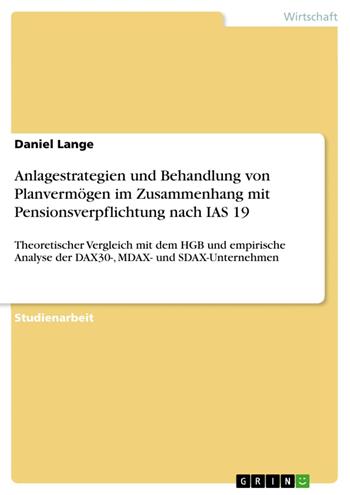 Studienarbeit aus dem Jahr 2011 im Fachbereich BWL - Rechnungswesen, Bilanzierung, Steuern, Note: 1,0, Helmut-Schmidt-Universität - Universität der Bundeswehr Hamburg, Veranstaltung: Empirische Analyse der deutschen IFRS-Anwendung, Sprache: Deutsch, Abstract: Die Existenzsicherung im Alter und die Ausgestaltung des Generationenvertrags sind, angefeuert durch die demografischen Entwicklungen, ein beständiges und kontrovers diskutiertes Thema der deutschen Politik. Nicht nur der Großteil der Bevölkerung, sondern auch die Bundesregierung glaubt jedoch mittlerweile, dass die gesetzliche Rentenversicherung zur Sicherung des Lebensstandards im Alter nicht mehr ausreicht. Dabei steigt die Bedeutung der betrieblichen Altersversorgung in dem Maße, wie das Versorgungsniveau der gesetzlichen Rente langfristig sinkt. Ziel dieser Arbeit ist es, die bilanziellen Abbildungsmöglichkeiten von Planvermögen darzustellen und die in der Praxis verwendeten Anlageformen des Planvermögens, insbesondere vor dem Hintergrund der Finanzkrise, zu kritisch zu analysieren. Zunächst werden dazu die bilanziellen Abbildungspflichten nach IFRS, die Saldierung bei Qualifikation des Kapitalstocks als Planvermögen sowie aktuelle Änderungen in diesem Zusammenhang dargestellt. Anschließend folgt eine Beschreibung der Bilanzierung und Saldierung nach deutschem Handelsrecht und der möglichen Anlageformen des Planvermögens. Im abschließenden empirischen Teil soll danach neben der Höhe und Bedeutung der Pensionsverpflichtung und des Planvermögens die aktuelle Zusammensetzung des Planvermögens anhand der DAX-Unternehmen untersucht werden.