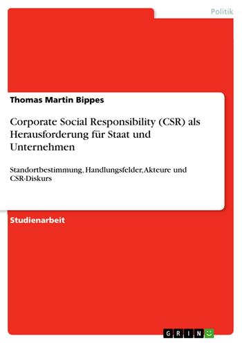 Studienarbeit aus dem Jahr 2008 im Fachbereich Politik - Grundlagen und Allgemeines, Note: 0, , Sprache: Deutsch, Abstract: -Gesellschaftliche Verantwortung von Unternehmen ? ein Thema, das in den vergangenen Jahren immer stärker diskutiert wird. Unter der Überschrift "Corporate Social Responsibility (CSR)" wurde in den vergangenen Jahren eine Vielzahl von Initiativen gestartet, die in Deutschland auch unter dem Begriff "Unternehmenssozialverantwortung" firmieren. Dabei handelt es sich um Initiativen, die zum Ziel haben, unternehmerische Verantwortung über den rein wirtschaftlichen Bereich auszudehnen. Flankiert wurden diese Bemühungen der Unternehmen von mehr oder weniger intensiven, mehr oder weniger erfolgreichen Bemühungen von Staaten und Staatenverbünden, um das Thema CSR zum Erfolg zu führen. Dabei steht nicht nur der Industriesektor mit seinen weltweit aufgestellten Kapitalgesellschaften im Vordergrund. Im Rahmen der vorliegenden Arbeit soll auch auf die Herausforderung für den Staat insbesondere darauf eingegangen werden. Wiss. Arbeit zum CSR-Seminar (bachelor-level) vom 19. und 20. November an der Universität Nitra