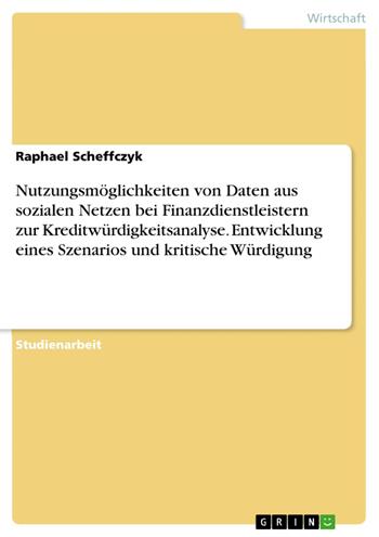 Studienarbeit aus dem Jahr 2015 im Fachbereich BWL - Bank, Börse, Versicherung, Note: 1.7, Universität Potsdam, Sprache: Deutsch, Abstract: Weltweit steigt die Anzahl der Internetnutzer kontinuierlich an. Im Jahr 2014 betrug die Anzahl der weltweiten Internetnutzer 2,925 Mrd. Die Aussicht auf eine Trendumkehr scheint in den nächsten Jahren unrealistisch. Mit dem Anstieg der Internetnutzer weltweit nimmt auch die Menge am Datenverkehr im Netz stetig zu. Heute wird in diesem Zusammenhang unter anderem von Big Data gesprochen. Diese Datenmengen bieten innovativen Finanzdienstleistern neue Möglichkeiten der Kreditwürdigkeitsanalyse. Speziell die Datenmengen, welche in sozialen Netzwerken, also bspw. in Facebook, Twitter oder LinkedIn, generiert werden, eignen sich zur Analyse der Kreditwürdigkeit des jeweiligen Nutzers. Einige innovative Unternehmen haben Algorithmen zur Analyse der Daten aus sozialen Netzen programmiert und sind nun in der Lage, erfolgreich damit zu wirtschaften und Kredite mit einer sehr geringen Ausfallwahrscheinlichkeit zu vergeben. Unternehmen, die eine Kreditwürdigkeitsanalyse durch soziale Netzwerke betreiben, sind im deutschen Marktumfeld derzeit kaum anzutreffen. Aus diesem Grund wird das Thema dieser Arbeit vorwiegend im internationalen Kontext untersucht. Das Ziel dieser Arbeit besteht demnach darin, die neuartigen, unterschiedlichen Nutzungsmöglichkeiten der Kreditwürdigkeitsanalyse aufzuzeigen, den Status quo abzubilden, ein plausibles Zukunftsszenario zu beschreiben und schließlich das Thema dieser Arbeit kritisch zu würdigen.