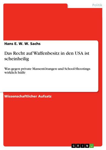 Wissenschaftlicher Aufsatz aus dem Jahr 2015 im Fachbereich Politik - Region: USA, Note: 1, , Sprache: Deutsch, Abstract: „Tod in der Schule und zu Hause. Amerikas erschossene Kinder“ ist eine Chronik betitelt, die am 30.10.2015 ganzseitig in den Lübecker Nachrichten erschien. Die Amerikaner stellen 4,5 % der Weltbevölkerung, aber in ihren Haushalten befinden sich 42 % aller Waffen, die weltweit im Privatbesitz sind. Das Recht, Waffen zu tragen, sollte trotz der jährlichen hohen Todesfallzahlen sogar noch stärker liberalisiert werden. 52 % der Amerikaner sind angeblich für weniger Waffenkontrollen. Warum dies der falsche Ansatz ist, begründet der Text. Kinder wachsen nicht deshalb sicherer auf, wenn sie den Umgang mit Waffen früh lernen. Es gibt nur einen Weg, böse Menschen mit einer Waffe in der Hand zu stoppen, und das ist ein guter Mensch mit einer Waffe, sagt die NRA (National Rifle Association). Zu einem guten Menschen wird man durch eine gute familiäre Betreuung. Und die fängt schon in der Schwangerschaft und bei der Geburt und den ersten Lebensjahren an. Die Mutterschutzgesetzgebung in den USA und die finanzielle Unterstützung der Mütter in den ersten drei Lebensjahren ihrer Kinder ist eine Katastrophe – die Folge ein anhaltendes inneres Unsicherheitsgefühl der Kinder und Erwachsen, das mit Waffen bei Erwachsenen nicht mehr zu bändigen ist.