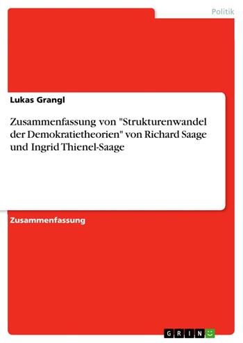 Zusammenfassung aus dem Jahr 2014 im Fachbereich Politik - Grundlagen und Allgemeines, Note: 2,0, FernUniversität Hagen, Sprache: Deutsch, Abstract: Diese Zusammenfassung bietet einen Überblick über das Einführungswerk "Strukturwandel der Demokratietheorien" von Richard Saage und Ingrid Thienel-Saage. Aus dem Inhalt: Demokratieverständnis der Antike. Partizipationsmodelle der Frühen Neuzeit. Demokratie am Vorabend der Französischen Revoltution. Demokratietheorie in der Französischen Revolution. Demokratietheorien des 19. Jahrhunderts in Frankreich und England. Demokratie in Deutschland ab 1800. Demokratietheoretische Paradigmen in den ersten Republiken in Deutschland und Österreich. Reduzierte Demokratietheorien im Schatten des 2. Weltkrieges.