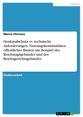 Studienarbeit aus dem Jahr 2014 im Fachbereich Kunst - Architektur, Baugeschichte, Denkmalpflege, Note: 1,1, Hochschule Anhalt - Standort Dessau (Architektur/Denkmalpflege), Veranstaltung: Denkmal und Technik - Methodologie der Denkmalpflege II, Sprache: Deutsch, Abstract: Mit dem Reichstagsgebäude in Berlin als auch dem Reichsgerichtsgebäude in Leipzig sollen in dieser Arbeit zwei Bauten des ausklingenden deutschen Historismus näher betrachtet werden. Die Umnutzungen sowie die damit verbundenen Anforderungen an Technik und Veränderungen an der Bausubstanz prägten beide Bauten. Einzelne Aspekte sollen dabei exemplarisch betrachtet werden, um den Grad der Einflüsse zu erkennen sowie zu bewerten. Beide Gebäude verfügen über eine wechselhafte Geschichte, bedingt durch verschiedene Staatsformen und Kriegseinflüsse. Im Zuge dieser wechselhaften Zeiten, die Europa neu prägen sollten, variierte die Nutzung beider Gebäude – letztlich aber werden nun beide Gebäude wieder in den Funktionen genutzt, für die sie einst geplant waren. Das Reichsgerichtsgebäude beherbergt heute den Deutschen Bundestag, während im Reichsgerichtsgebäude das Bundesverwaltungsgericht seinen Dienstsitz nahm.
