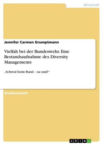 Studienarbeit aus dem Jahr 2016 im Fachbereich BWL - Unternehmensführung, Management, Organisation, Note: 2,3, Sanitätsakademie der Bundeswehr München (Sanitätsakademie der Bundeswehr München (Direktorat Forschung, Wissenschaft und Weiterentwicklung)), Veranstaltung: Innere Führung & Menschenführung, Sprache: Deutsch, Abstract: Diese Seminararbeit aus dem Jahr 2016 im Ausbildungsfach Menschenführung, Innere Führung an der Sanitätsakademie der Bundeswehr in München befasst sich mit einer Bestandsaufnahme zur Thematik Diversity unter dem Titel: „Vielfalt bei der Bundeswehr. Eine Bestandsaufnahme des Diversity Managements - „Schwul beim Bund – na und?-“ Diversity an sich mag als Begriff innerhalb der Bundeswehr (Bw) den Meisten noch fremd sein. Ins Gespäch kam das Thema zuletzt im Februar 2014 als die bundeswehrspezifische Fachzeitschrift „Y- Das Magazin der Bundeswehr“ einen Leitartikel mit dem Titel „Kameraden zeigen Gesicht“ veröffentlichte. Gerade in diesem genannten Artikel wird jedoch deutlich, dass Soldaten homosexuellen Kameraden innerhalb der Bw nicht immer mit Toleranz begegneten und anzunehmen ist, dass sie dies auch heute noch nicht immer tun. Dieser Umstand wird in der veröffentlichten Hausarbeit intensiv und differenziert beleuchtet. Betrachtete Personengruppe, ist hierbei der Soldat in den deutschen Streitkräften. Es wird untersucht, in wie weit es heute innerhalb der Bundeswehr noch nicht egal ist, sich innerhalb der Streitkräfte als schwul zu outen. Zunächst wird eine einheitliche Definition des Begriffes „Diversity“ hergeleitet. Daraus erschließen sich die erforderlichen Erläuterungen zu den verschiedenen Diversity Dimensionen sowie dem Diversity Management (DiM) im Allgemeinen. Insbesonder interne Reglements der Bundeswehr werden betrachtet.