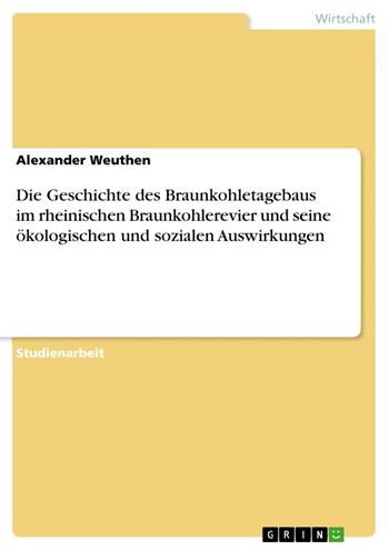 Studienarbeit aus dem Jahr 2016 im Fachbereich BWL - Wirtschafts- und Sozialgeschichte, Note: 1,7, Rheinisch-Westfälische Technische Hochschule Aachen (Wirtschafts, Sozial und Technologiegeschichte), Sprache: Deutsch, Abstract: Die Geschichte des Braunkohletagebaus im rheinischen Revier von seinen Anfängen bis heute. Ein besonderes Augenmerk wird hierbei auf die ökologischen sozialen Aspekte des Tagebaus gelegt und seine aktuelle Bedeutung, wie auch seine zukünftige Rolle diskutiert. Seit über 200 Jahren stellt der Braunkohleabbau einen wichtigen Industriezweig für das Rheinland dar. Aufgrund der großen Vorkommen verhalf dieser Bodenschatz der Region in der Industrialisierung zu enormen technologischen Entwicklungen und wirtschaftlichen Wohlstand. Aber er prägte auch massiv das Landschaftsbild. Betrachtet werden hier nicht nur der technische Fortschritt, sondern auch die historischen Verflechtungen und somit auch die Rolle des Braunkohleabbaus und des rheinischen Braunkohlereviers im Nationalsozialismus oder auch anderen politischen Bewegungen. Dabei wird der Zeitraum von der ersten Entdeckung der Braunkohle im rheinischen Revier bis in die jüngere Gegenwart beleuchtet. Im Fazit wird zudem ein Ausblick auf die Bedeutung und die künftige Entwicklung des Braunkohleabbaus in Westdeutschland gegeben.