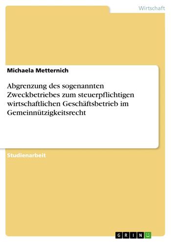 Studienarbeit aus dem Jahr 2016 im Fachbereich BWL - Rechnungswesen, Bilanzierung, Steuern, Note: 2,0, Hochschule RheinMain, Sprache: Deutsch, Abstract: Das Ziel dieser Hausarbeit ist es, die Abgrenzung zwischen Zweckbetrieben und wirtschaftlichen Geschäftsbetrieben näher zu erläutern und die Grauzonen zu definieren. Das Gemeinnützigkeitsrecht ermöglicht es gemeinnützigen Körperschaften, entgegen des im Steuerrecht allgemein gültigen Individualprinzips, den sog. Zweckbetrieb steuerneutral zu unterhalten, d.h. die gemeinnützigen Körperschaften im Rahmen ihres gemeinnützigen Satzungszweckes steuerlich zu entlasten. Das Ziel dieser Steuerentlastung soll die Förderung des Satzungszweckes dienen. Neben dem sog. Zweckbetrieb, können gemeinnützige Körperschaften auch wirtschaftliche Geschäftsbetriebe unterhalten, welche der vollen Besteuerung unterliegen. Das Ziel der Abgrenzung zwischen Zweckbetrieb und wirtschaftlicher Geschäftsbetrieb, ist es eine Körperschaft so zu unterstützen, dass sie ihre gemeinnützigen Zwecke erreichen kann ohne dass sie sie den Wettbewerb durch steuerfreie Gewinne schädigen kann. In der Praxis ist die Abgrenzung zwischen Zweckbetrieb und wirtschaftlicher Geschäftsbetrieb nicht klar zu differenzieren.