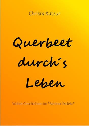 Die Berliner Autorin Christa Katzur, jetzt am Bodensee beheimatet, schreibt im „Berliner Dialekt „ sehr herzerfrischende , selbst erlebte Geschichten. Das Leben ist voller Zufälle, kleiner Wunder, man muss sie nur wahrnehmen. Teilweise etwas satirisch, doch sehr humorvoll, nimmt sie den Leserkreis mit, in die „ Tierwelt, in verzwickte Ehe-Familiengeschichten, sehr amüsante „ Deutsch-Russische Geschichten“ zum Schluss in die besinnliche Weihnachtszeit. „ Querbeet durchs Leben“ ! Ein großes Anliegen von ihr ist, den „ Berliner Dialekt „ aufzubewahren , für die Nachwelt zu erhalten. Viele Worte sind schon längst Vergangenheit, sie hat sie wieder reanimiert, und stellt sie Ihnen, liebe Leserwelt zur Verfügung. Schmunzeln Sie mit ihr, wenn Sie mit Ihnen auf „ Aujust's Brautschau „ jeht! Oda, Herrn „ Kulla „ een Klavier andreht! Und wenn' se denn mit Herrn „ Kulla „ uff eene janz besondre „ Kreuzfahrt „ jeht, bleibt keen Oge trocken! Greifen Sie zu, gute Laune und viel Spaß für trübe Stunden, garantiert Ihnen Christa Katzur