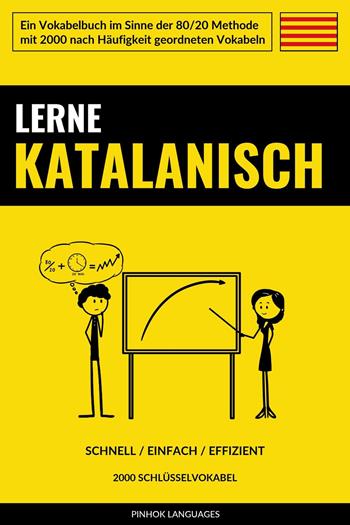 Dieses Vokabelbuch beinhaltet 2000 der häufigsten Katalanisch Vokabel und Redewendungen und wurde im Sinne des Pareto-Prinzips (80/20 Regel) zusammengestellt. Ziel des Buches ist es, den Lernprozess so weit wie möglich zu optimieren indem die wichtigsten Wörter und Sätze zuerst gelernt werden. Das Resultat ist ein einzigartiges Vokabelbuch ideal für hochmotivierte Lernende. Wer sollte dieses Katalanisch Lehrbuch kaufen? Dieses Vokabelbuch ist ideal für motiviert Anfänger und Fortgeschrittene, die bereit sind, täglich 15 bis 20 Minuten Katalanisch Vokabel zu lernen. Der schnörkellose Inhalt des Buches in Form von Vokabellisten ist ein Resultat des Optimierungsprozesses und bewusst gewählt, sodass Ihre Lernzeit so gut wie möglich genutzt wird. Wenn Sie bereit sind, täglich 20 Minuten in das Lernen der Katalanisch Vokabel in diesem Buch zu investieren, dann ist dieses Buch die wahrscheinlich beste Investition, die Sie für einen raschen Lernfortschritt machen können. Die so möglichen Fortschritte innerhalb weniger Wochen bei täglichem Üben werden Sie überraschen. Wer sollte dieses Buch nicht kaufen? Wenn Sie sich bereits auf Katalanisch mit anderen unterhalten können, raten wir vom Kauf dieses Buches ab und legen Ihnen unser umfangreicheres Katalanisch Vokabelbuch ans Herz. Darin finden Sie über 3000 Vokabel nach Themen gruppiert, wodurch Sie Ihr Vokabular nach Belieben in verschiedenen Themengebieten vertiefen können. Weiters ist dieses Buch nicht für Sie geeignet, wenn Sie auf der Suche nach einem All-in-One Katalanisch Sprachkurs sind. Dieses Lehrbuch ist ein reines Vokabelbuch ohne Dinge wie Grammatik oder Betonungsanleitung. Dieser Fokus auf Vokabular und Grundwortschatz ist bewusst gewählt und ermöglicht es motivierten Lernenden, durch das Erlernen der wichtigsten Vokabel sehr schnell Fortschritte zu machen.