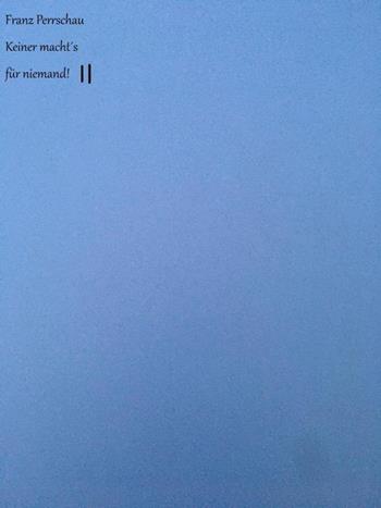 "Keiner macht´s für Niemand!", Teil II: Dreizehn neue Schlagertitel zum Mitschmunzeln möchten wir dem werten Publikum hier vorstellen. Wiederum verfasst von Franz Perrschau und Ludwig Gsanghofer, wobei wir diesmal auf die gleichzeitige Mitveröffentlichung der Melodien verzichtet haben. Gute Unterhaltung damit wünschen nun die Autoren und der Herausgeber! 4.Saubermachen goes Zen: (1./5) Zen hier! Zen da! Zen trallala! Doch, wer macht mal die Bude sauber, bei dem ganzen Budenzauber? Na, da wird erstmal richtig mieditiert! Refr.: Zen hier! Zen da! Zen trallala! Das ist doch alles wunderbar! Zen hier! Zen da! Zen trallala! Da ist doch alles klar! 13. Jahresendgesang zum Jahresausklang!: 1. Erst Weihnachtszeit, dann Knallerei! Ein Schlückchen Sekt, schon ist´s vorbei! Zuerst, da ist die Freude groß! Doch, gleich geht das Malheur von vorne wieder los! 2. Die Vorsätze, die Guten, Schönen! Der inn´re Schweinehund ist schon am stöhnen!: "So schlimm war es mitnichten doch! Man könnte doch ein bisschen noch!" 3. "Wir bleiben hart!", schießt´s gleich zurück, "Der Mensch muss kämpfen, für sein Glück!" Der Hund gibt zu: "Ein bisschen schon! Doch hat man wirklich was davon?" 4. Wie geht das aus, wo geht das hin? Wer wird am End den Kürz´ren ziehn? Doch, sieget auch der Schweinehund, Hauptsache ist, man bleibt gesund!"