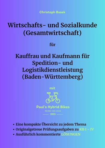 Dieses Buch ist genau das Richtige, um dich während deiner Ausbildungszeit effektiv und zeitsparend für Klassenarbeiten in Gesamtwirtschaft und für die Abschlussprüfung „Wirtschafts- und Sozialkunde“ vorzubereiten. Es enthält: 9 prüfungsrelevante Aufgaben zu Kompetenzbereich 1, 9 prüfungsrelevante Aufgaben zu Kompetenzbereich 2, 9 prüfungsrelevante Aufgaben zu Kompetenzbereich 3 und 6 prüfungsrelevante Aufgaben zu Kompetenzbereich 4. Zusätzlich sind alle Themen jeweils auf einer Seite übersichtlich zusammengefasst. Zudem sind alle Aufgaben mit einer prüfungsgerechten Bearbeitungszeit und ausführlich kommentierten Lösungsvorschlägen versehen. Das Buch wird durchgehend von Paul Hybrid begleitet, der das Unternehmen "Paul's Hybrid Bikes e. K." leitet. Paul's Unternehmen verkauft neben selbstgebauten Fahrrädern auch Handelswaren wie Fahrradhelme oder Fahrradbekleidung.