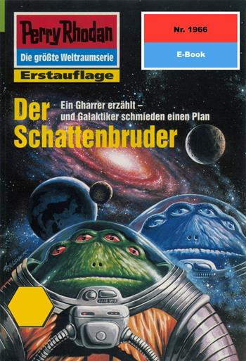 Ein Gharrer erzählt - und Galaktiker schmieden einen Plan Als Mhogena, der Fünfte Bote von Thoregon, über die Brücke in die Unendlichkeit ins Solsystem zu den Terranern kam, hoffte er auf die Hilfe der Menschheit. Sein Volk, die wasserstoffatmenden Gharrer, ist nämlich von einer ungeheuren Gefahr bedroht: Invasoren haben die Galaxis Chearth angegriffen und das Verderben über zahlreiche bewohnte Planeten gebracht. Das ist nicht alles. Die Invasoren beabsichtigen, den geheimnisvollen Sonnentresor zu öffnen. Wenn sie dies tun, werden die Guan a Var ausbrechen, die Sonnenwürmer - und das würde über kurz oder lang den Tod der ganzen Galaxis bedeuten. Hinter der Attacke steckt offensichtlich Shabazza, der Gegenspieler der Koalition Thoregon. Seine Machenschaften sorgten bereits in der Milchstraße und anderen Galaxien für Tod und Vernichtung. Mhogena errang bei seinem Besuch auf der Erde nur einen kleinen Erfolg. Aus der Milchstraße brach eine winzige Hilfsflotte auf: die GILGAMESCH der Zellaktivatorträger unter Befehl des Arkoniden Atlan und zehn Kampfschiffe der wasserstoffatmenden Maahks. Mit dieser bescheidenen Streitmacht nimmt Atlan den Kampf gegen die Invasoren auf. Immerhin konnten erste Erfolge verzeichnet werden. Mhogena lüftet derweil ein Geheimnis seiner Vergangenheit - über den SCHATTENBRUDER ...