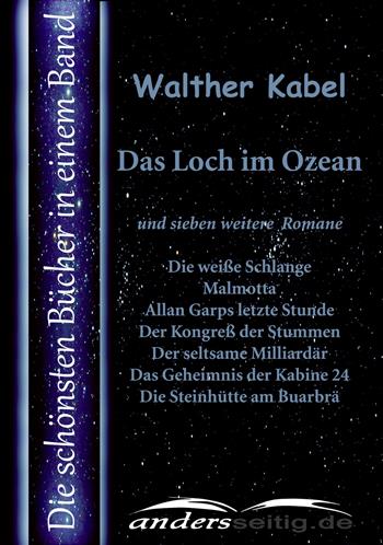 Die schönsten Bücher von Walther Kabel (Pseudonym Olaf K. Abelsen, Max Schraut) sind hier in einem Band zusammengefasst. Wir lesen von Walther Kabel: Die weiße Schlange, Das Loch im Ozean, Malmotta – das Unbekannte, Allan Garps letzte Stunde, Der Kongreß der Stummen, Der seltsame Milliardär, Das Geheimnis der Kabine 24 und Die Steinhütte am Buarbrä.