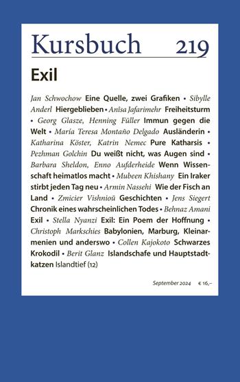 "Selbst im Exil ist es nicht so schlimm zu leben wie allein im Vaterlande" – das schrieb Stefan Zweig in seinem Londoner Exil, und in diesem Satz ist die Spannung des Exils gut aufgehoben. Das, was der Exilant zurücklässt, muss so schlimm sein, dass ein Exil besser ist als dies – und doch bleibt das Zurückgelassene das Eigene. Im Exil zu sein, ist nicht einfach ein Ortswechsel, sondern eine Multiplikation von Orten im Exilanten selbst. Genau diese Orte und Knotenpunkte sucht dieses Kursbuch auf. Sibylle Anderl rät allen Erdlingen von künftigen Mars- oder Weltraumexilen ab. Armin Nassehi stellt die Frage, ob der Fisch überhaupt weiß, dass er im Wasser lebt und einen Begriff des Wassers haben kann. Christoph Markschies zeigt, wie das babylonische Exil der Juden bis heute den Horizont ihres Selbstverständnisses prägt. Georg Glasze und Henning Füller wiederum beschäftigen sich mit Konzepten von Privatstädten, gewissermaßen Wohnexilen auf dem Planeten, die gerade in Saudi-Arabien und andernorts entstehen. Ein besonderes inneres Exil thematisiert das Interview mit Katrin Nemec und Katharina Köster. Die beiden Dokumentarfilmerinnen haben mit ihrem Film "Jenseits von Schuld" Eltern eines Serienmörders begleitet, die sich behaupten müssen: als Eltern, die verkraften müssen, dass ihr eigenes Kind unfassbare Verbrechen begangen hat, und als Menschen, die von außen als exakt solche Eltern wahrgenommen werden. Jens Siegert beschäftigt sich mit einem abgelehnten Exil, nämlich mit dem Fall Alexej Nawalnys, der trotz aller Drohung und trotz Anschlägen auf sein Leben im Exil nach Russland zurückkehrte und in einem Lager zu Tode kam. Barbara Sheldon und Enno Aufderheide berichten von der Philipp Schwartz-Initiative der Alexander-von-Humboldt-Stiftung, die sich Wissenschaftlerinnen und Wissenschaftlern im Exil annimmt und ihnen wissenschaftliche Arbeitsmöglichkeiten in Deutschland bietet. Ein Schwerpunkt dieses Kursbuchs sind literarische Arbeiten von acht Autorinnen und Autoren, die allesamt in Deutschland im Exil sind, weil sie in ihren Heimatländern verfolgt werden und keine Chance haben, frei und ohne Repression zu arbeiten. Es sind Behnaz Amani (Iran), María Teresa Montaño Degado (Mexiko), Pezhmann Golchin (Iran), Anisa Jafarimehr (Kurdistan/Iran), Collen Kajakoto (Simbabwe), Mubeen Khishany (Irak), Stella Nyanzi (Uganda) und Zimicier Vishniou (Belarus).