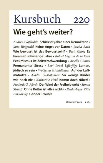 Die Grundfrage von Kursbuch 220, der 50. Ausgabe seit dem Relaunch im Jahr 2012, lautet: »Wie geht´s weiter?« Dabei geht es nicht um das Kursbuch an sich, sondern um die Frage wie es überhaupt weitergeht. Denn: In unserer Gesellschaft gibt immer weniger Kontinuitäten, immer mehr Infragestellungen der Zukünfte an sich. Immer mehr plakative Großdiagnosen, immer weniger Raum für fachliche Expertise, individuelle Erfahrungswelten und gute Argumente. Deshalb haben die Herausgeber:innen Armin Nassehi, Sibylle Anderl und Peter Felixberger genau diese Frage 13 Gesprächspartner:innen aus Wirtschaft, Wissenschaft, Kunst und Kultur gestellt. Wie es weitergeht, wird in konkreten gegenwärtigen Erfahrungen, Konstellationen, Risiken, Potenzialen und Chancen fundiert. Die Gespräche beschäftigen sich mit der Zukunft des Jüdischen in unserer Gesellschaft, mit Cyberkriminalität, mit der Möglichkeit und Bedeutung von Kunst und Kultur, mit Geschlechter- und Migrationsfragen, mit Zukunftstechnologien, mit Sprunginnovationen, mit dem Älterwerden und nicht zuletzt mit der überaus schwierigen Frage, was sich über die Zukunft überhaupt sagen lässt. Die Gesprächspartner:innen der Jubiläumsausgabe: Andreas Voßkuhle, Jana Ringwald, Joscha Bach, Berit Glanz, Rafael Laguna de la Vera, Ariella Chmiel, Levi Israel Ufferfilge, Wolfgang Schmidbauer, Aladin El-Mafaalani, Katherine Held, Frederik G. Pferdt, Simon Strauß und Paula-Irene Villa Braslavsky.