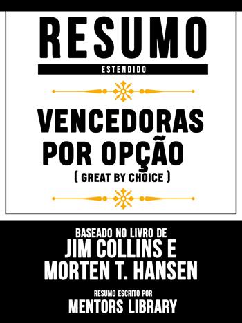 RESUMO ESTENDIDO: VENCEDORAS POR OPÇÃO (GREAT BY CHOICE) - BASEADO NO LIVRO DE JIM COLLINS E MORTEN T. HANSEN-SOBRE O LIVRO ORIGINAL Sabedoria dentro desta leitura é derivada de uma profunda pesquisa sobre o ambiente de negócios. É caracterizada pela incerteza e mudança constantes. Com esses contratempos, muitas empresas não conseguem sobreviver aos primeiros anos de vida. No entanto, outras grandes empresas alcançam o oposto: elas prosperam em meio ao caos.Victorious estudou essas empresas, verificou que o sucesso vem de qualidades como disciplina, a inovação com cuidado e uma paranoia saudável (sim, não é tal uma coisa). Com esta combinação, a sorte não é um fator necessário para que a grandeza alcance empresa.-CONTEÚDOCAPÍTULO 01: O Que Distingue Equipes Vencedoras Daquelas Que Falham?CAPÍTULO 02: Quais São Os Três Comportamentos Fundamentais?CAPÍTULO 03: Qual É A Regra Para Atingir Os Objetivos?CAPÍTULO 04: Pequenas Balas Antes De Balas De Canhão?CAPÍTULO 05: Inovação Não É Tudo?CAPÍTULO 06: É Útil Se Preocupar Com O Futuro?CAPÍTULO 07: Como São Criados Os Melhores Procedimentos Operacionais?CAPÍTULO 08: Existe Sorte?-SOBRE MENTORS LIBRARYOS LIVROS SÃO MENTORES. Eles podem orientar o que fazemos em nossas vidas e como fazemos. Muitos de nós amamos os livros e vários deles até permanecem na nossa memória algumas semanas depois de lidos, mas depois de 2 anos não podemos mais nos lembrar se o lemos de fato ou não. E isso não é bom. Lembramos que, na época, tal livro significava muito para nós. Por que é que esquecemos tudo depois? Este resumo expressa as ideias mais importantes do livro original. Muitas pessoas não gostam de ler, só querem saber o que o livro diz que elas devem fazer. Se você confia no autor, não precisa dos argumentos. A maioria dos livros são argumentos para as ideias do leitor, mas muitas vezes não precisamos de argumentos se confiamos na fonte. Podemos entender a ideia imediatamente. Toda esta informação está no livro original. Este resumo faz o esforço de reduzir redundâncias e transformá-las em instruções diretas para as pessoas que não pretendem ler o livro em sua totalidade. Esta é a missão do MENTORS LIBRARY.