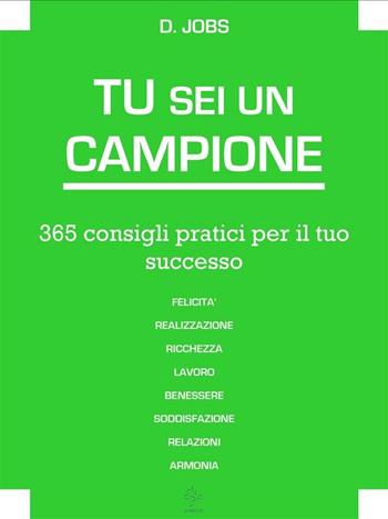 Questo manuale ti darà dei semplici e veloci consigli per essere un vero campione nella tua vita, indipendentemente da quello che fai, da quello che hai, dalla tua età, dal tuo sesso, dalla tua nazionalità, dalla tua fede e da tutto ciò che ti riguarda. Come ogni essere umano anche TU puoi trarre il meglio da questa esistenza realizzando i tuoi sogni. Come vedrai saranno lezioni di vita dirette e sintetiche, perché ciò che conta non sono le troppe parole ma piuttosto i fatti. Bisogna muoversi e non restare fermi. Fai di questo libro un buon amico e compagno di viaggio, puoi consultarlo tutte le volte che vuoi basta anche una pagina al giorno, sarà il tuo consigliere personale.
