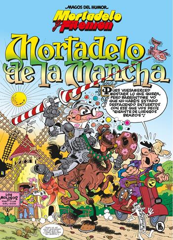 Número 107 de la colección «Magos del humor». Mortadelo de La Mancha, es un homenaje a la universal obra de Miguel de Cervantes, Don Quijote de La Mancha, en el cuarto centenario de la edición de la primera parte. Por un error al utilizar un invento del profesor Bacterio, Mortadelo y Filemón creerán ser los protagonistas de la obra universal de Miguel de Cervantes, Don Quijote de la Mancha. Mortadelo será Don Quijote y Filemón su fiel escudero Sancho Panza (Filemoncho Panza).Juntos irán a desfacer entuertos, aunque solamente lograrán un desastre tras otro. Ofelia será la particular Dulcinea del Toboso de Mortadelo. Mortadelo y Filemón hablarán en castellano antiguo y el propio Francisco Ibáñez tiene un protagonimo especial en esta obra, ya que aparece comentando los acontecimientos que en la aventura se van produciendo. Sobre la colección: La colección «Magos del Humor» nació en la editorial Bruguera en el año 1984 recuperando títulos que ya habían sido publicados en su antecesora «Ases del Humor» (1969). Debido al cierre de Bruguera en 1986, en esta etapa solo llegaron a ver la luz los primeros 12 volúmenes de la serie, pero en 1987 Ediciones B retomó la publicación de la colección desde su primer número hasta la actualidad. «Magos del Humor», con su formato coleccionista en tapa dura de 210 x 290 mm, es la colección en la que aparecen por primera vez las aventuras inéditas de Mortadelo y Filemón y de Superlópez, aunque también puede encontrarse material de grandes personajes de Bruguera como Zipi y Zape de Escobar, 13, Rue del Percebe, Pepe Gotera y Otilio, El botones Sacarino, La familia Trapisonda y Rompetechos de Ibáñez, Los cuentos de tío Vázquez o La familia Cebolleta de Manuel Vázquez, entre otros.
