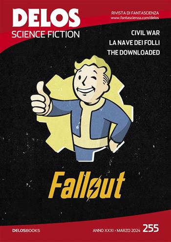 Fantascienza - rivista (53 pagine) - Alla serie TV tratta dall'omonimo videogioco è dedicato lo speciale del numero 255 della nostra rivista di approfondimento. Non è ormai inusuale che un videogioco di grande successi sia adattato a serie TV. Anzi, la prassi è diventata quasi una costante del mondo dell'intrattenimento sul piccolo schermo. Di per sé non è un fatto negativo, ma in qualche modo certifica una certa carenza di idee a Hollywood e dintroni, dove le produzioni originali sono davvero molto poche. L'importante, in ogni caso, è che l'adattamento funzioni e sia una sorta di espansione della storia che è stata originariamente ideata per il game. In tal senso, l'omonimo adattamento del videogioco Fallout sul piccolo schermo ci sembra una delle cose più riuscite di questo 2024 e l'uscita italiana ci ha convinto a dedicare a questa serie TV lo speciale del numero 255 di Delos Science Fiction, la nostra rivista di approfondimento, curato da Arturo Fabra. Anche Civil War, il nuovo film di Alex Garland a cui abbiamo dedicato un servizio, è al centro delle "chiacchiere" social e dell'attenzione dei grandi giornali, per il fatto di raccontare in modo realistico un possibile scenario futuro di un'America devasta da una guerra civile. A Emiliano Maramonte abbiamo chiesto di parlarci in un'intervista dell'antologia La nave dei folli (Delos Digital), di cui è curatore, che presenta racconti fantastici e fantascientifici ispirandosi a un capolavoro dell'Arte. Nella sezione rubriche, lo scrittore Antonino Fazio si chiede se le IA sono intelligenti come gli umani, dal punto di vista fantacientifico ovviamente, mentre Andrea Cattaneo ci racconta del rapporto fra sogni e fantascienza. Ancora, Giuseppe Vatinno raconta i retroscena del film classico Uomini sulla Luna. L'intervista impossibile di questo mese è nientemeno che a Howard Phillips Lovecraft. Nel suo editoriale, il curatore Carmine Treanni celebra la rivista Robot, fondata da Vittorio Curtoni e oggi diretta da Silvio sosio, che ha raggiunto il traguardo dei 100 numeri, eletta dagli addetti ai lavori e dagli appassionati la più bella rivista di fantascienza. Il racconto è di Giovanni Scipioni dal titolo La divisa militare, mentre l'anteprima è dedicata all'uscita di Ricordi proibiti (Delos Digital), il romanzo del premio Urania Giovanni De Matteo. Rivista fondata da Silvio Sosio e diretta da Carmine Treanni.