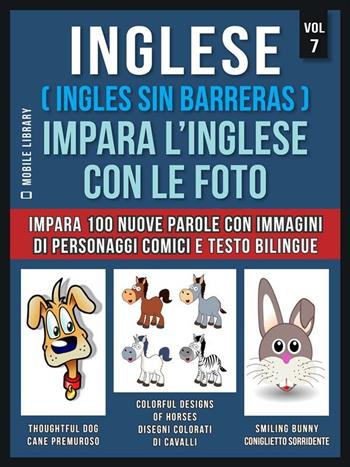Il volume 7 di questa raccolta (che ti insegna come imparare con l'aiuto delle immagini) sarà ancora più divertente: impariamo facilmente e rapidamente 100 nuove parole usando caratteri comici e testo bilingue. Questo libro riunisce i 2 migliori metodi per imparare l'inglese in modo facile e veloce: - Il metodo Word e Picture - La lettura bilingue (edizione parallelo) Imparare il vocabolario 'inglese con questo libro è molto semplice: - Vedi l'immagine - Leggi il nome in inglese - Leggi la parola corrispondente in italiano Ogni nuova immagine ti aiuterà a memorizzare una parola nella nuova lingua. Basta vedere l'immagine e imparare una nuova parola, quindi passare all'immagine successiva e fare la stessa cosa. Passo dopo passo, vedrai che inizi a capire e memorizzare sempre più parole in l'inglese! Basta vedere l'immagine e imparare a dirlo in inglese.