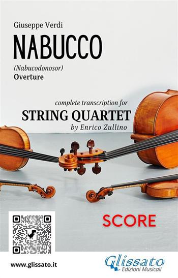 "Nabucco" ouverture dall'opera di Giuseppe Verdi. Trascrizione completa per Quartetto d'Archi, di livello medio/avanzato, a cura di Enrico Zullino.Partitura: Violino I, Violino II, Viola, Violoncello (parti staccate disponibili nella collana). ___________________________________ "Nabucco" (Nabucodonosor) overture - by Giuseppe Verdi. Complete transcription for string quartet by Enrico Zullino - advanced/intermediate level. Score: Violin I, Violin II, Viola, Cello. Duration 7.00 (+-) min. Key A. (Single parts available in series).