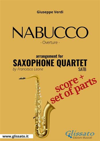 "Nabucco" overture by Giuseppe Verdi, arranged for Saxophone Quartet SATB (advanced level) by Francesco Leone. Score : Bb Soprano, Eb Alto, Bb Tenor and Eb Baritone. Parts available in series. Key concert: F / duration 6.30 (+-). Audio demo available on www.glissato.it - product code: EG0525