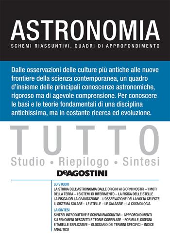 Dalle osservazioni delle culture più antiche alle nuove frontiere della scienza contemporanea, un quadro d'insieme delle principali conoscenze astronomiche, rigoroso ma di agevole comprensione. Per conoscere le basi e le teorie fondamentali di una disciplina antichissima, ma in constante ricerca ed evoluzione. Lo studio: la storia dell'astronomia, i moti della Terra, i sistemi di riferimento, la fisica delle stelle, la fisica della gravitazione, l'osservazione della volta celeste, il sistema solare, le stelle, le galassie, la cosmologia. La sintesi: sintesi introduttive e schemi riassuntivi, approfondimenti su fenomeni descritti e teorie correlate, formule, disegni e tabelle esplicative, glossario dei termini specifici, indice analitico.