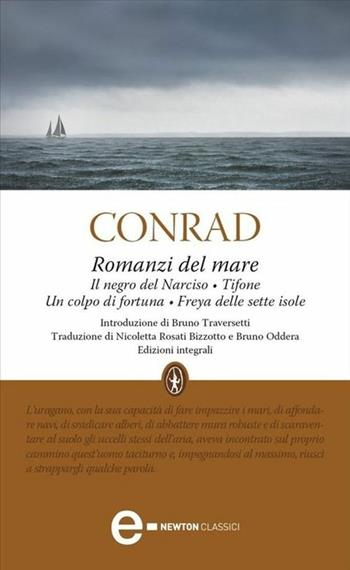 Il negro del Narciso • Tifone • Un colpo di fortuna • Freya delle sette isole Introduzione di Bruno Traversetti Traduzione di Nicoletta Rosati Bizzotto e Bruno Oddera Edizioni integrali Il nome di Conrad è indissolubilmente legato al mare. In numerosi romanzi e racconti, infatti, lo scrittore ha trasferito, rievocandole e trasfigurandole col soffio del mito, le sue avventure di vagabondo degli oceani, e in particolare delle rotte orientali. Questo volume riunisce, oltre a Il negro del Narciso (1897) e a Tifone (1903) – tra i più celebri romanzi brevi di Conrad – Un colpo di fortuna e Freya delle Sette Isole, entrambi del 1912, storie di mare nelle quali compaiono due singolari personaggi femminili. In queste pagine il magico mondo del mare è descritto in tutti i suoi aspetti: l’ostilità e la furia degli elementi, l’esistenza dura degli equipaggi, gli uomini e le donne che popolano i porti, le coste, le navi, i sogni e gli incubi dei marinai. «L’uragano, con la sua capacità di fare impazzire i mari, di affondare navi, di sradicare alberi, di abbattere mura robuste e di scaraventare al suolo gli uccelli stessi dell’aria, aveva incontrato sul proprio cammino quest’uomo taciturno e, impegnandosi al massimo, riuscì a strappargli qualche parola.» Joseph Conrad (Józef Konrad Korzeniowsky) nacque nel 1857 a Berdiczew, nella Polonia meridionale. Nel 1874 cominciò a viaggiare per mare. Dieci anni più tardi, ottenuta la cittadinanza inglese, trasformò il suo vero nome in quello con il quale è universalmente conosciuto e si affermò come uno dei più grandi scrittori di lingua inglese, pur essendo il polacco la sua lingua madre. Morì nel 1924. Sue celebri opere sono Cuore di tenebra, Il reietto delle isole (1896), Lord Jim (1900), Nostromo (1904), La linea d’ombra (1917). Di Conrad la Newton Compton ha pubblicato anche Cuore di tenebra e altri racconti d’avventura, Lord Jim, L'agente segreto, Romanzi del mare (Il negro del Narciso, Tifone, Un colpo di fortuna, Freya delle sette isole).