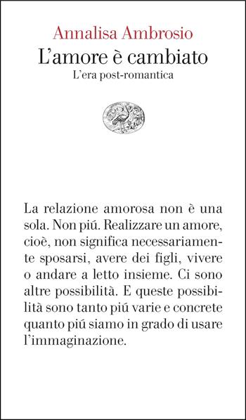 La relazione amorosa non è una sola. Non piú. Realizzare un amore, cioè, non significa necessariamente sposarsi, avere dei figli, vivere o andare a letto insieme. Ci sono altre possibilità. E queste possibilità sono tanto piú varie e concrete quanto piú siamo in grado di usare l'immaginazione. È possibile superare il mito tradizionale dell'amore senza negarsi il piacere di perdere la testa per qualcuno? Forse sí, a patto di capire che cosa fare se si è innamorati nell'era post-romantica. L'amore è cambiato perché la cultura terapeutica, l'istituto giuridico del divorzio, le lotte dei movimenti LGBTQIA+ hanno allargato la morfologia delle relazioni amorose. La relazione amorosa non è una sola. Non piú. Realizzare un amore, cioè, non significa necessariamente sposarsi, avere dei figli, fare sesso o vivere sotto lo stesso tetto a lungo. Ci sono altre possibilità. E queste possibilità sono tanto piú varie e concrete quanto piú siamo in grado di usare l'immaginazione.