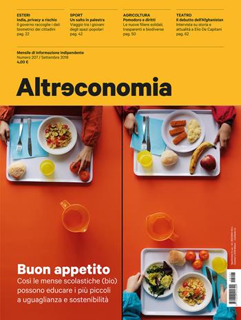 In questo numero: - Sostenibilita` e uguaglianza nel piatto: a scuola anche le mense possono educare. Oltre un milione e 200mila studenti ogni giorno condividono il pasto. In forte crescita la presenza di prodotti bio; - Come si viaggia in “crociera”. Il racconto di chi soccorre i migranti. Il racconto di Giovanna Scaccabarozzi, medico, che ha affrontato ogni genere di urgenza sulle navi Ong; - Siamo stati in India, dove il governo raccoglie i dati biometrici dei cittadini. Aadhaaar, un sistema che mette a rischio la privacy ed espone al rischio di abusi; - L’avvocata africana che si batte contro il piombo. E vince. Intervista a Phyllis Omido, di Mombasa, in Kenya, attivista contro l’inquinamento nella borgata di Owino Uhuru, una delle piu` povere della citta`; - Incendi di rifiuti, i sindaci chiedono di non essere lasciati soli. Il punto da Torino alla Terra dei Fuochi, dove bruciano depositi e discariche, spesso abusivi. Il problema e` nazionale e la regia probabilmente unica; - Nelle palestre popolari la passione per lo sport si coltiva da piccoli. Una risposta alla sedentarieta` e al business dello sport; - Dalle oasi di Tor Bella Monaca uno sguardo diverso sul quartiere. Tra i palazzoni di edilizia popolare e le piazze dello spaccio, nella periferia romana fioriscono numerose esperienze culturali e sociali; - Ecco le nuove filiere del pomodoro: solidali, trasparenti, biodiverse. Dalla Campania alla Brianza, per offrire un’alternativa bio ed equa alla Grande distribuzione organizzata; - Chi aiuta i migranti bloccati in Bosnia, lungo la rotta dell’Europa. Reportage dalla cittadina di Velika Kladus?a, a pochi chilometri dalla frontiera croata, tra i volontari che assistono oltre 500 profughi; - Il “grande gioco” dell’Afghanistan raccontato da Elio De Capitani. Con lo spettacolo “The great game / Enduring freedom” il teatro da` voce a una storia complessa, capace di parlare anche all’Italia e all’Europa di oggi; - La cura dei burattini secondo Eliseo Bruno Niemen. Da quasi trent’anni, grazie alle storiche marionette di legno della tradizione piemontese, aiuta bambini e ragazzi a superare le proprie paure; e tanto altro ancora...