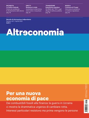 In copertina ECONOMIA Dall’energia alla finanza: cambiare modello per costruire davvero un’economia di pace Primo tempo INCHIESTA Come sta cambiando lo sfruttamento delle vittime di tratta ESTERI In India aumentano discriminazioni e violenze contro i musulmani FOSSIL FREE La repressione non ferma la lotta alla crisi climatica nelle Filippine ECONOMIA Dipesh Chakrabarty. Una nuova lettura dell’antropocene Secondo tempo DIRITTI La vita dei rifugiati in Turchia attraverso lo sguardo dei bambini TRANSIZIONE ECOLOGICA La svolta “energetica” delle case popolari grazie al Superbonus 110% ALTRE ECONOMIE In montagna lo sviluppo sostenibile non passa solo dal turismo lento I NOSTRI LIBRI La cultura diventa nomade: l’Italia è tutta un festival DIRITTI Il centro che in Burkina Faso prova a sfatare i tabù sulla salute mentale Terzo tempo MUSICA Tutto l’universo di Giovanni Truppi tra musica, diritti e politica CINEMA Yuri Ancarani. Venezia non è (solo) romantica Rubriche Editoriale di Duccio Facchini Obiettivo Monitor La salute al caleidoscopio di Nicoletta Dentico Il clima è (già) cambiato di Stefano Caserini Il diritto di migrare di Gianfranco Schiavone Semi in viaggio di Riccardo Bocci Distratti dalla libertà di Lorenzo Guadagnucci Il dizionario economico dell’ignoto di Alessandro Volpi Piano terra di Paolo Pileri Osservatorio sulla coesione di Massimo Baldini, Francesca Campomori ed Emmanuele Pavolini Avviso pubblico di Pierpaolo Romani Un volto che ci somiglia di Tomaso Montanari Una finestra sul commercio equo a cura di Equo Garantito La pagina dei librai a cura di Binaria, il centro commensale del Gruppo Abele Idee eretiche di Roberto Mancini