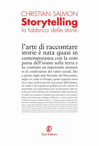 L’arte di raccontare storie è nata quasi in contemporanea con la comparsa dell’uomo sulla terra e ha costituito un importante strumento di condivisione dei valori sociali. Ma a partire dagli anni Novanta del Novecento, negli USA come in Europa, questa capacità narrativa è stata trasformata dai meccanismi dell’industria dei media e dal capitalismo globalizzato nel concetto di storytelling: una potentissima arma di persuasione nelle mani dei guru del marketing, del management, della comunicazione politica per plasmare le opinioni dei consumatori e dei cittadini. Dietro le più importanti campagne pubblicitarie – ancor più dietro quelle elettorali vincenti (da Bush a Sarkozy) – si celano proprio le sofisticate tecniche dello storytelling management o del digital storytelling. Questo è l’incredibile inganno ai danni dell’immaginario collettivo svelato da Christian Salmon nel libro, frutto di una lunga inchiesta dedicata alle numerose applicazioni del fenomeno: il marketing conta più sulla storia dei brand che sulla loro immagine, i manager si servono di aneddoti per motivare i propri dipendenti, i soldati in Iraq si allenano su videogiochi progettati da Hollywood, gli spin doctor descrivono la vita politica dei loro clienti come in un racconto. L’autore ci mostra gli ingranaggi della grande “macchina narrante” che ha rimpiazzato il ragionamento razionale, ben più pervasiva dell’iconografia orwelliana della società totalitaria. Ma questo nuovo ordine narrativo non è un semplice linguaggio mediatico: il soggetto che vuole influenzare è un individuo immerso in un universo fittizio che ne filtra le percezioni, ne stimola le sensazioni, ne inquadra i comportamenti e le idee. «Christian Salmon è sicuramente uno dei più lucidi e coraggiosi intellettuali francesi attuali». Antonio Tabucchi, «l’Unità» «Un breve saggio rigoroso, arduo, ma che aiuterà a decifrare il fenomeno affascinante dello storytelling». «Le Nouvel Observateur» «Il libro di Christian Salmon aprirà un mondo a chi si interessa alle forme narrative e ai loro nuovi usi sociali». «Libération» «Storytelling decodifica la tecnica narrativa che ha invaso l’universo della comunicazione politica». «l’Humanité»