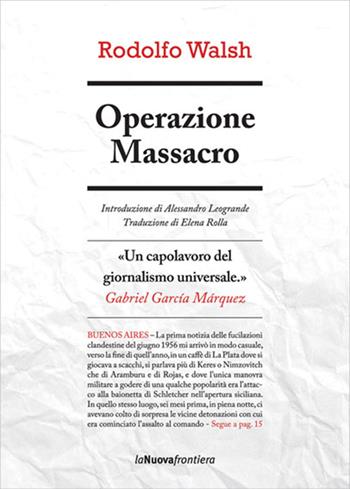 Otto anni prima di A sangue freddo di Truman Capote, con Operazione Massacro, Rodolfo Walsh inventa una nuova forma di giornalismo, a metà strada tra il romanzo e la cronaca, che solo un decennio dopo verrà conosciuta universalmente come New Journalism. Pubblicato nel 1957, il libro racconta l'uccisione di un gruppo di civili innocenti perpetrata dalla prima giunta militare golpista, un efferato episodio di violenza che sarebbe passato sotto silenzio se Walsh non vi si fosse imbattuto casualmente. Rodolfo Walsh segue la pista come un segugio, indaga, ricostruisce dettagliatamente i fatti, scopre la cospirazione e scrive un libro di denuncia che, pur restando un'insuperata lezione di giornalismo d'inchiesta, si legge come un romanzo. Rodolfo Walsh nasce nel 1924, in Argentina. Scrittore, giornalista e militante politico, nel 1959 a Cuba fondò l'agenzia di stampa Prensa Latina con Jorge Masetti e Gabriel García Márquez. Nel 1961, decifrando un cablogramma della CIA, rivelò al mondo il coinvolgimento nordamericano nell'invasione della Baia dei Porci. Dal 25 marzo del 1977, il giorno dopo aver inviato la celebre Lettera aperta di uno scrittore alla Giunta Militare, il suo nome compare nella lunga lista dei desaparecidos. Ma né il suo sequestro né la sua uccisione sono mai riusciti a ridurre al silenzio le sue parole, un esempio universale di rigore morale e lotta per la libertà.