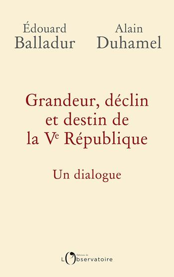 Édouard Balladur a été un acteur majeur de la Ve République. Alain Duhamel a observé et rencontré tous ceux qui ont fait son Histoire. Dans cet échange de vues, ils retracent soixante ans de vie politique pour finalement répondre à cette question : le régime politique pensé par de Gaulle est-il encore porteur d’espoirs ? « Depuis 1958, la Ve République tranche et concilie la réalité d’un exécutif fort et d’une démocratie de plus en plus exigeante. La voici menacée de décadence. Peut-elle y faire face ? Le phénomène Macron en esquisse-t-il une réponse ? Rebat-il les cartes ? À quoi va ressembler la France qui vient ? » Alain DUHAMEL « La Ve République a eu de grands moments. Depuis, elle a décliné, connu l’instabilité politique, l’inefficacité des gouvernements. L’avenir impose à la France de profondes réformes, le renforcement de l’Europe mais aussi le devoir d’assurer la permanence de la nation. La nécessité d’un pouvoir fort justifie la Ve République. » Édouard BALLADUR