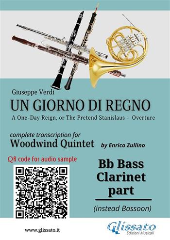 Bb Bass Clarinet (instead Bassoon) part of " Un giorno di regno" (A One-Day Reign, or The Pretend Stanislaus) overture by G. Verdi. Complete transcription for Woodwind Quintet by Enrico Zullino (Flute, Oboe, Bb Clarinet, Horn and Bassoon) advanced level. duration 6.00 min (+-). Score & Parts available in series. Scan Qr-code (in cover) for audio demo or visit www.glissato.it product code: EG0597. Un giorno di regno, ossia Il finto Stanislao is an operatic melodramma giocoso in two acts by Giuseppe Verdi to an Italian libretto written in 1818 by Felice Romani. Originally written for the Bohemian composer Adalbert Gyrowetz the libretto was based on the play Le faux Stanislas written by the Frenchman Alexandre-Vincent Pineux Duval in 1808. Un giorno was given its premiere performance at the Teatro alla Scala, Milan on 5 September 1840.