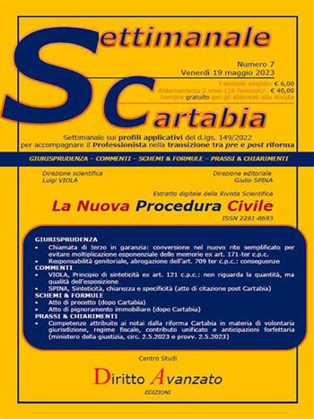 Settimanale, estratto della Rivista LanovaProceduracivile, sui profili applicativi del d.lgs. 149/2022 per accompagnare il Professionista nella transizione tra pre e post riforma. CONTENTI: GIURISPRUDENZA: Chiamata di terzo in garanzia: conversione nel nuovo rito semplificato per evitare moltiplicazione esponenziale delle memorie ex art. 171-ter c.p.c.; Responsabilità genitoriale, abrogazione dell’art. 709 ter c.p.c.: conseguenze; COMMENTI: VIOLA, Principio di sinteticità ex art. 121 c.p.c.: non riguarda la quantità, ma qualità dell’esposizione; SPINA, Sinteticità, chiarezza e specificità (atto di citazione post Cartabia); SCHEMI & FORMULE: Atto di precetto (dopo Cartabia); Atto di pignoramento immobiliare (dopo Cartabia); PRASSI & CHIARIMENTI: Competenze attribuite ai notai dalla riforma Cartabia in materia di volontaria giurisdizione, regime fiscale, contributo unificato e anticipazioni forfettaria (ministero della giustizia, circ. 2.5.2023 e provv. 2.5.2023).